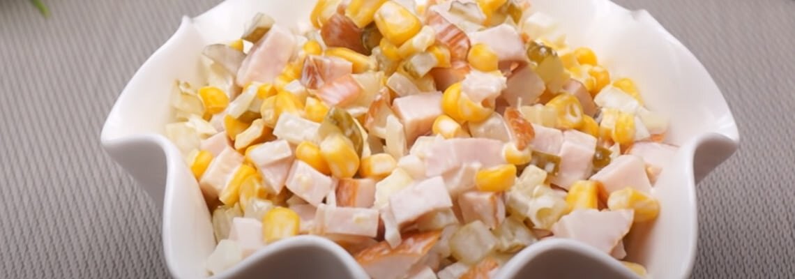 5. В салатнике смешиваем мясо, огурцы, кукурузу и лук без маринада.