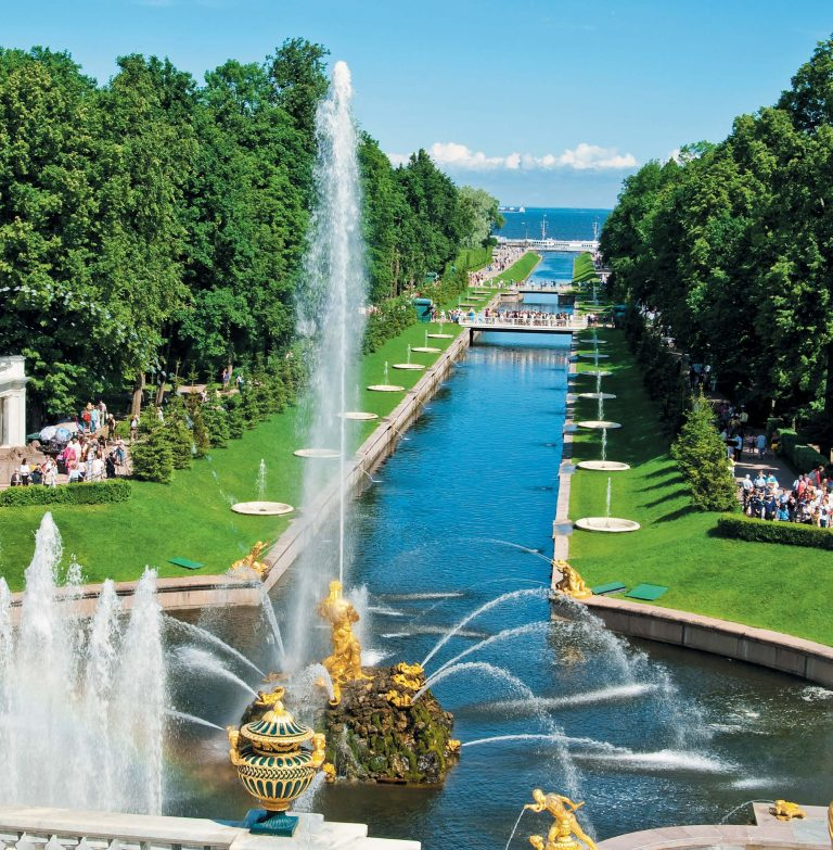 Большой каскад напротив парадного входа во дворец — это волшебная феерия. Золотые статуи богов и героев, шахматная мраморная плитка, беломраморная лестница, сочная зелень деревьев — все это дарит ощущение чуда и наполняет душу радостью и гордостью. В композиции воплощена идея триумфа, власти, силы и победы, и это не может не воздействовать на чувства зрителей. Гуляя по парку в чередовании открытых солнечных пространств и тенистых аллей, можно пройти к веранде Монплезира — любимейшего дворца Петра Великого. Присев на одну из скамеек, обращенных к морю, вы неизбежно погрузитесь в умиротворенное состояние. Не зря царь назвал свой голландский домик «мое удовольствие».