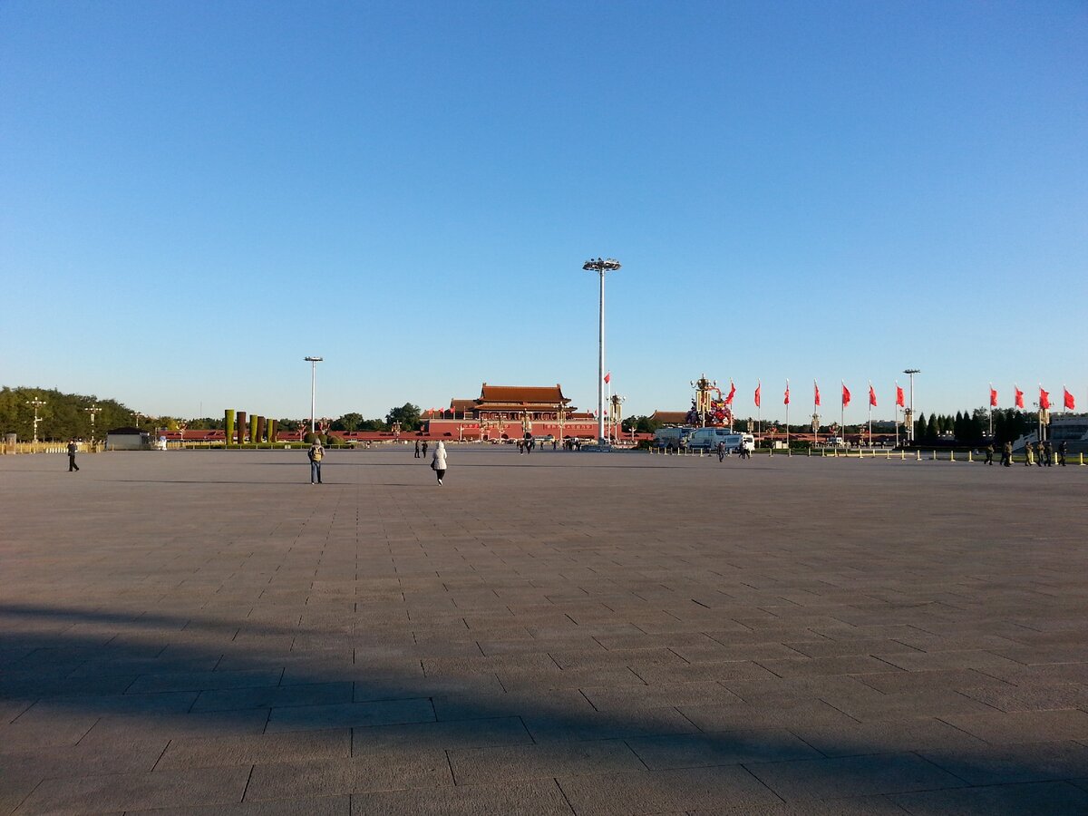 В этот день собственно и началось мое путешествие по Китаю. Приняв утренние процедуры, съев в номере нехитрый русско-китайский завтрак (русская каша, китайские хлеб и кофе), я бодренько направился в сторону площади Тяньаньмэнь. С этого «сердца» Пекина начинались все мои дни в этом городе. Этим утром я отстоял умеренную очередь к пропускному пункту, прошел на, как я думал еще, полупустую площадь. На самом деле полупустой Тяньаньмэнь в 7:30 утра бывает «уже» после утреннего подъема флага и «еще» до начала работы музеев. В это утро я просто осмотрел площадь. Честно сказать она меня разочаровала. Это место выделяет только два обстоятельства: гигантский размер (самая большая площадь в мире) и «Врата небесного спокойствия» с портретом Мао.