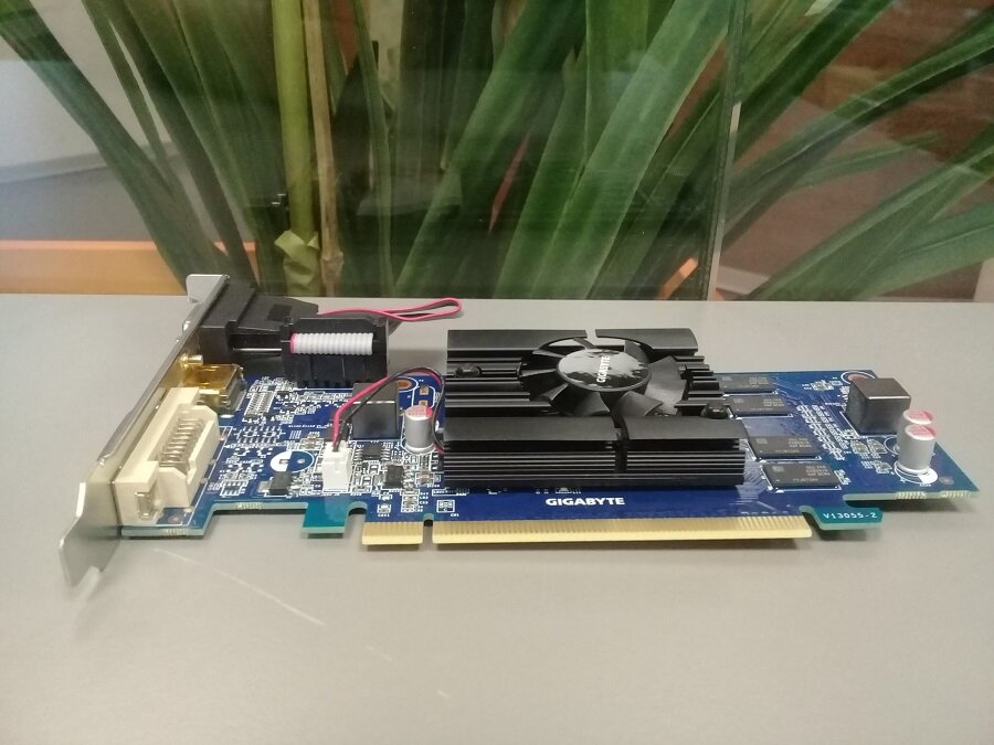 Неплохая видеокарта для офисного компьютера. GIGABYTE nVidia GeForce 210, модель GV-N210D3-1GI. У меня в руках модель ревизии 6.0, на сайте производителя данная ревизия отмечена как совместимая с Windows 10. Для дома тоже подойдёт, только на современные игры не стоит рассчитывать, всё-таки карточке уже 10 лет. Для фильмов, учёбы, работы, фотошоп потянет, на TV картинку со звуком выведет.