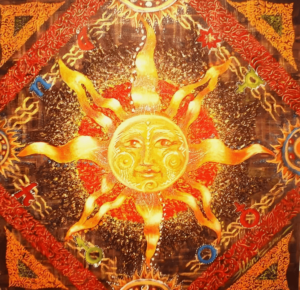 Символом солнца являлся огненный шар с расходящимися в разные стороны лучами. Обычно изображали 8 лучей, так как считалось, что число восемь - это не только символ бесконечности, но и энергия созидания.