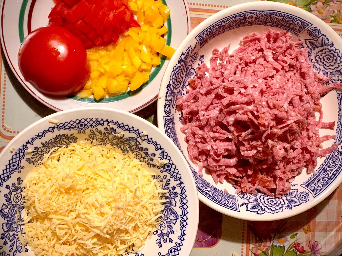 Итак, предлагаю сначала подготовить ингредиенты. Колбасу натрем на крупной терке, сыр на мелкой, помидорку и перчик мелко порежем кубиком.