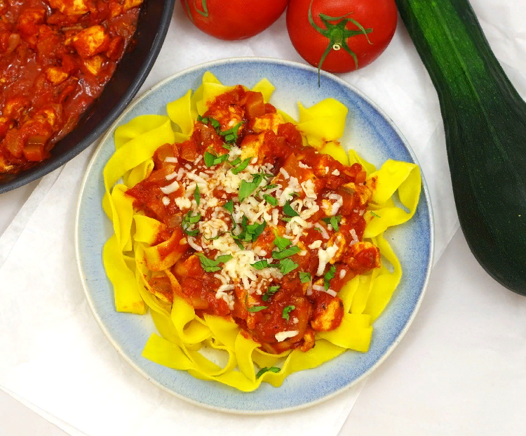 Макароны с кабачками и курицей в томатном соусе, посыпаются моцареллой и базиликом.