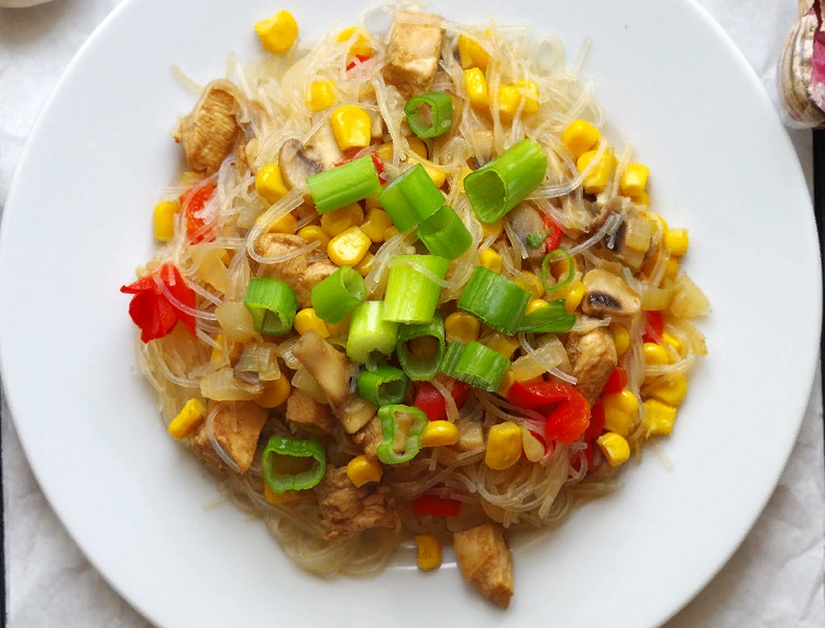 Тоненькие макароны с ароматным цыпленком, маринованном в соевом соусе, имбире и рисовом уксусе. Идея быстрого обеденного блюда.
