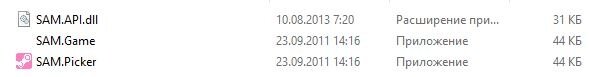 2-Распаковываем скачанный архив в любое место на компьютере, но не в папку со Steam и получаем 3 файла: SAM.API.dll, SAM.Game.exe и SAM.Picker.exe.