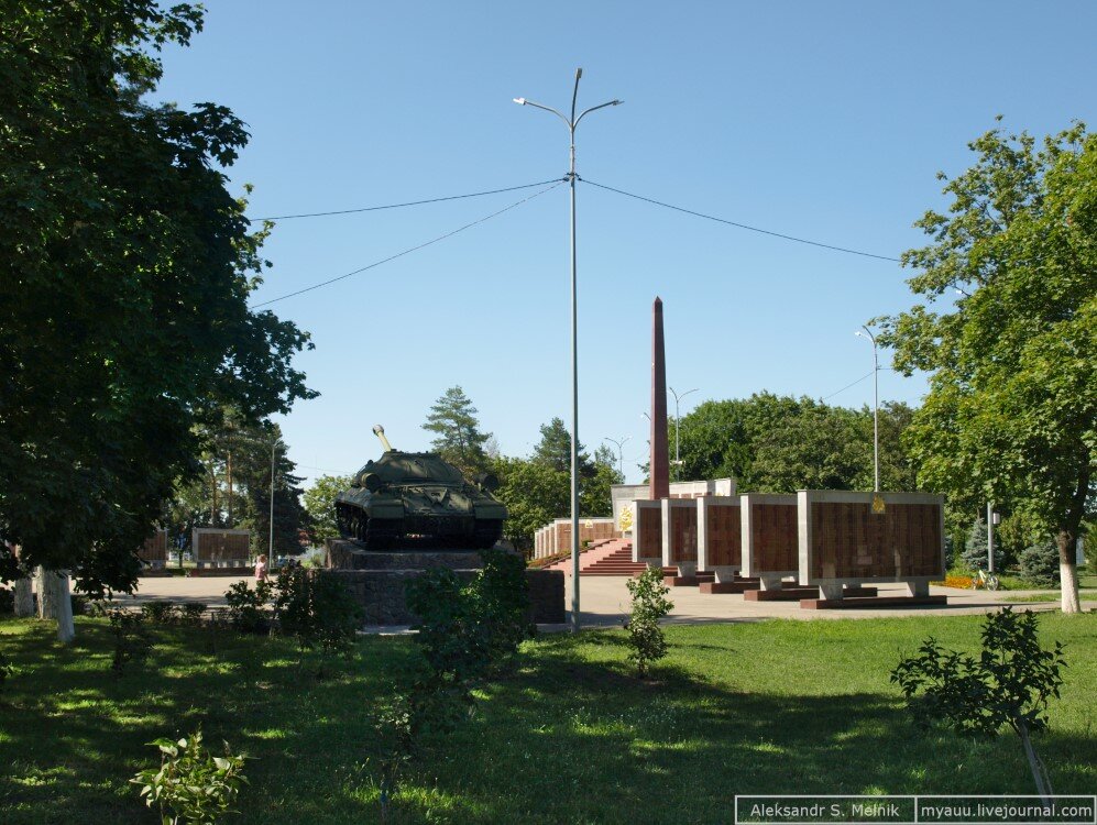 Этот послевоенный танк символизирует боевые машины, которые были построены на деньги собранные жителями Лабинского района в 1943-1944 годах.