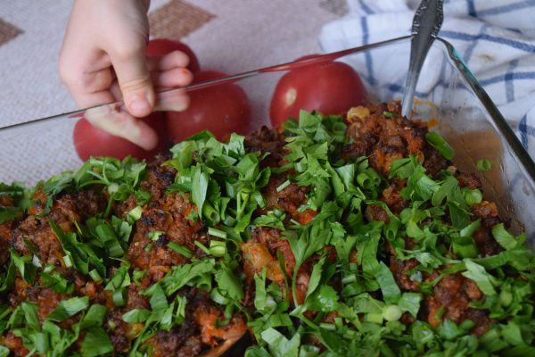 Тем временем разогреваем духовку до 180 градусов. Теперь выкладываем начинку в баклажаны и укладываем в форму, в которую заранее выложили овощную подушку. Ставим в духовку примерно на полчаса. При подаче посыпаем обильно зеленью, приятного аппетита!)