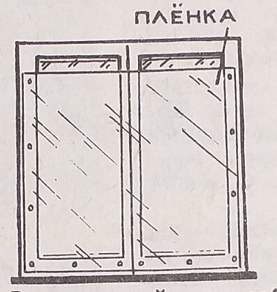 1.Простейший способ – взять полиэтиленовую пленку, вырезать по размерам окна и прикоепить к раме липкой лентой,например, как показано на рисунке.