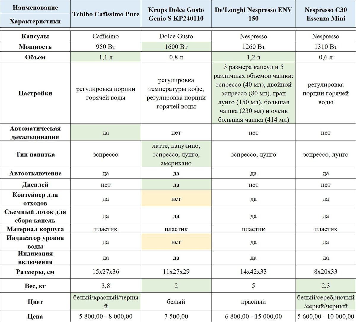 - возможность приготовить от 3 до 4 чашек кофе (так как у всех небольшой объем резервуара с водой)