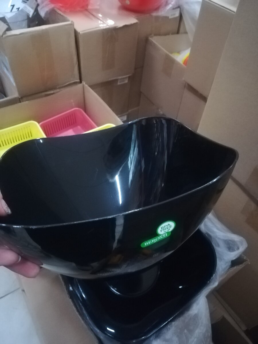 Цена данным удовольствия всего 75 руб за салатник объёмом 3 л плотный глянцевый черный пластик смотрится достойно и красиво.
