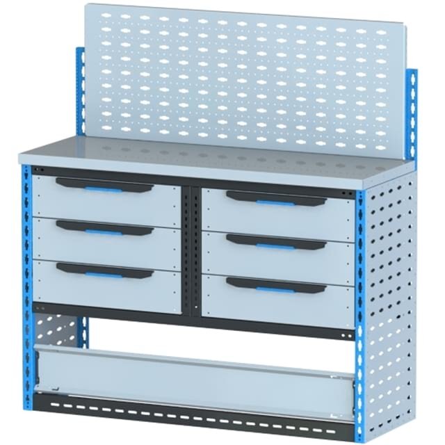 Модуль предназначен для размещения инструмента и запчастей. В комплектации имеются различные по высоте выдвижные ящики, оборудованные клавишными блокираторами. Столешница позволяет установить слесарные тиски. Нижний отсек оснащен быстросъемным откидным бортом.Рекомендован к установке вдоль левого борта кузова автомобиля, над колёсной аркой.