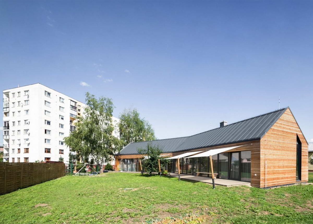 Дерево было выбрано в качестве основного строительного и облицовочного материала, так как напоминает типичные структуры, которые обычно можно увидеть в словацких дворах и садах. Эти деревянные сараи можно найти рядом, они до сих пор являются частью некоторых из окружающих дворов. Архетипичная форма сарая была вытеснена вдоль северного края участка и разбита в середине, чтобы максимизировать солнечные условия. Застеклённый фасад стирает границу между интерьером и экстерьером и обеспечивает прочную связь с садом. Одно из существующих грушевых деревьев даёт тень для деревянной террасы, которая непрерывно смешивает внутреннее пространство с внешним.