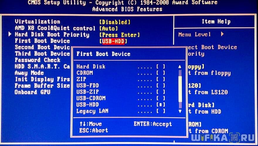 (Первое устройство в списке загрузки должно быть USB-HDD).
