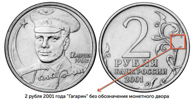 Всё, сказанное выше о пятёрках, справедливо и для двушек 2002 и 2003 гг. Однако высокую ценовую планку держит ещё одна двухрублёвая позиция, выпущенная к 40-летию полёта Юрия Гагарина. Над выпуском работали оба монетных двора, поэтому в узоре из листьев мы можем разглядеть как округлый логотип ММД, так и вытянутый товарный знак СПМД. Но часть московской продукции отправилась в оборот вообще без обозначения монетного двора. Если вам досталась такая двушка, то её цена 10 000 – 12 000. Однако при продаже готовьтесь предъявлять качественные фотографии (особенно фрагмент, где должен располагаться логотип). Доказательства, что знак монетного двора не зашлифован вручную, должны быть весомыми.