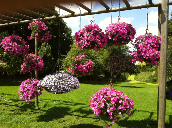 Выращивание ампельных растений в подвесных горшках – отличная идея для тех случаев, когда недостаточная площадь участка не позволяет посадить желаемое количество цветов. Также кашпо могут быстро улучшить вид не слишком привлекательного фасада или изгороди. А ещё с их помощью можно создать полупрозрачную живую изгородь.