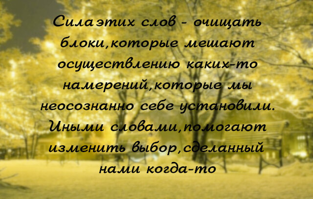 По утверждению авторов, сила этих слов - очищать блоки, которые мешают осуществлению каких-то намерений, которые мы неосознанно себе установили. Иными словами, помогают изменить выбор, сделанный нами когда-то.