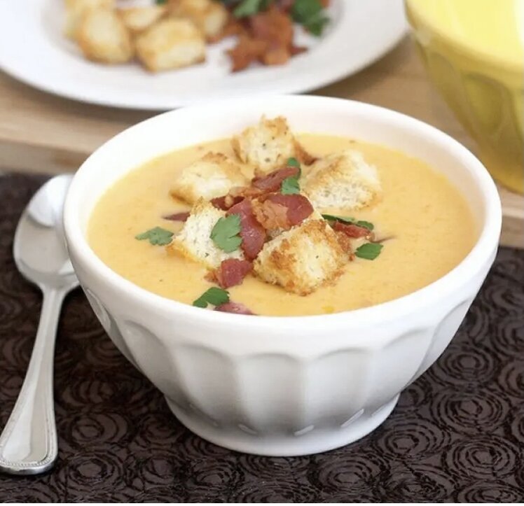 Подавайте горячий сливочно-сырный суп, посыпав его чесночными сухариками.