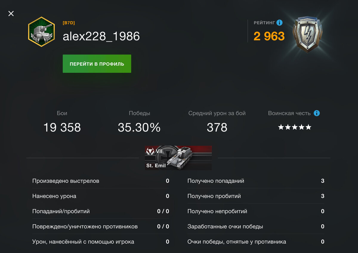 А вот 35% со средним уроном в 378, да на 19К боев, это уже подозрительно. Ну, думаю, очередное пробитие дна в категории "абсолютный анскилл". Уже разбирали подобных товарищей, и это заявка на "самого интересного".