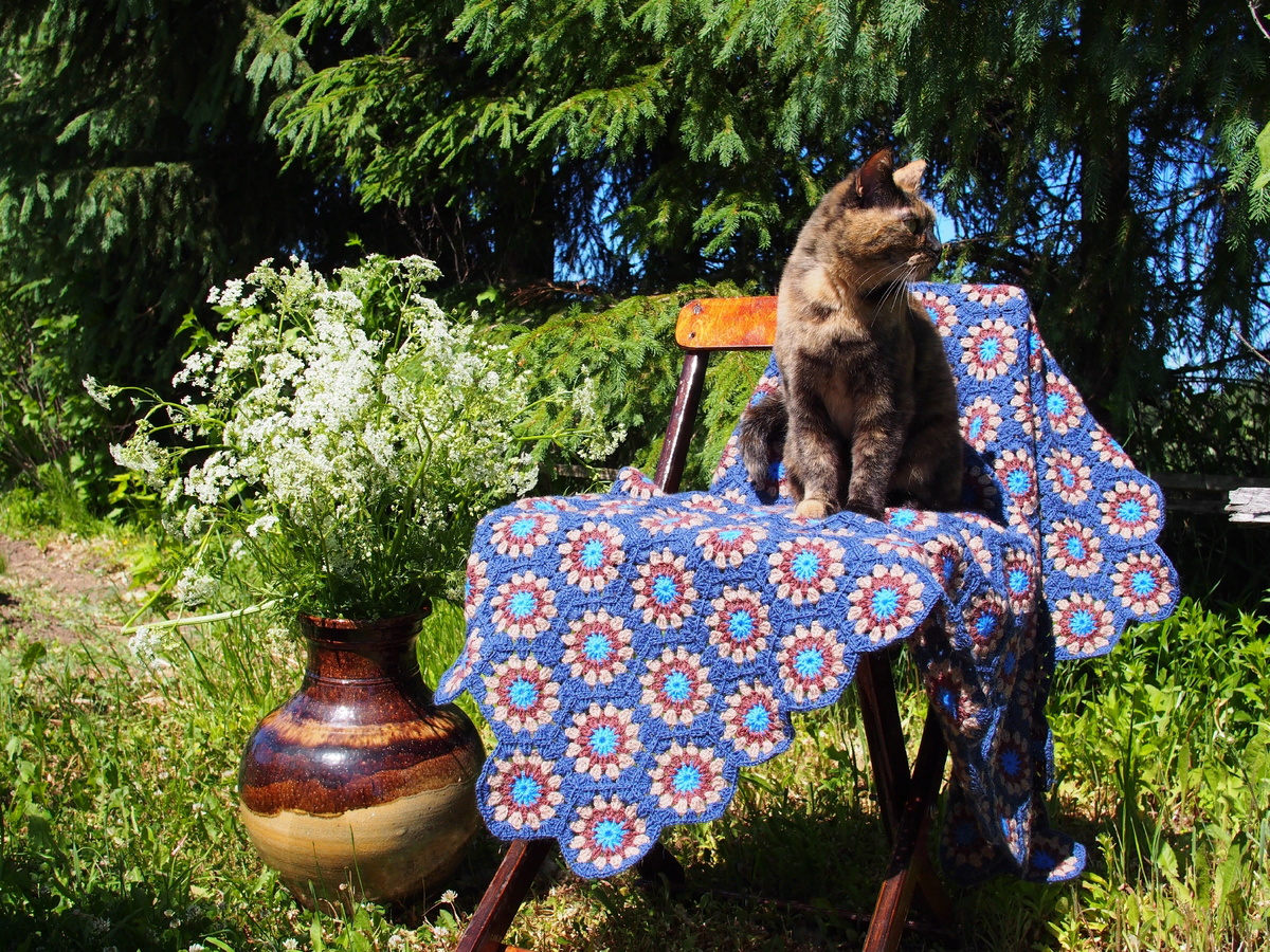 Вы спрашиваете, откуда я черпаю столько терпения для рутинной для многих работы по вывязыванию сотен мотивов. Посмотрите сами - разве здесь устоишь, когда так и тянет развесить плед на стареющем заборе. Пока он ещё держится, обвитый сухими плетями хмелины...