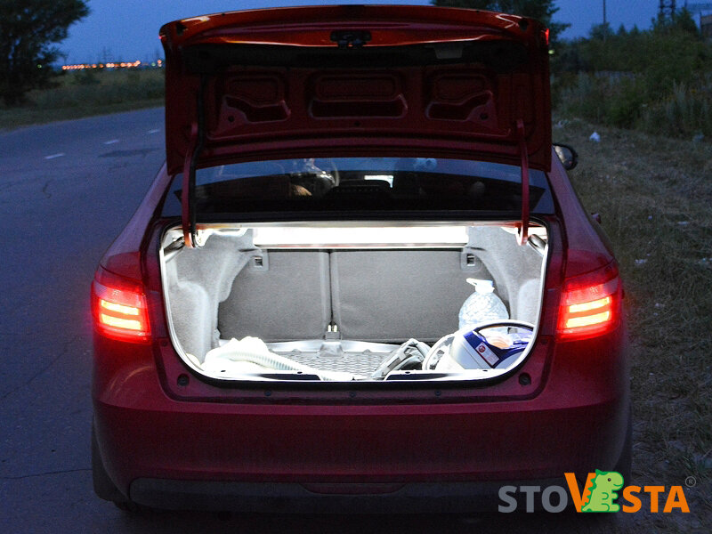Штатная подсветка багажника – причина недовольства многих водителей. Часто она недостаточно хороша даже на дорогих иномарках. Владельцы Лада Веста также столкнулись с этой проблемой. От подсветки багажника на Лада Веста слишком мало света. Она недостаточно хорошо освещает багажник – вечером и ночью приходится брать с собой фонарик, телефон или искать вещи наощупь. Водители отмечают, что заводская подсветка практически бесполезна и выполняет лишь роль украшения. Самое простое решение проблемы – установка светодиодной подсветки. Светодиоды отлично освещают пространство, устойчивы к повреждениям и потребляют мало энергии. Услугу, описанную в статье, Вы можете произвести в любом автосервисе StoVesta в Санкт-Петербурге. Также Вы можете воспользоваться бесплатной доставкой и заказать любую интересующую Вас запчасть или аксессуар. Установка светодиодной подсветки Обычно мы устанавливаем несколько светодиодов. Этого достаточно, чтобы полностью осветить багажник. Но по желанию клиента мы може