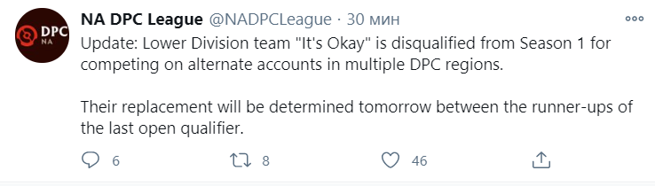 Официальная причина дисквалификации — участие в нескольких DPC-регионах на фейковых аккаунтах и под фейковыми именами. Напоминаем, что коллектив Its Okay смогли преодолеть вторую открытую квалификацию и заработать место в нижнем дивизионе