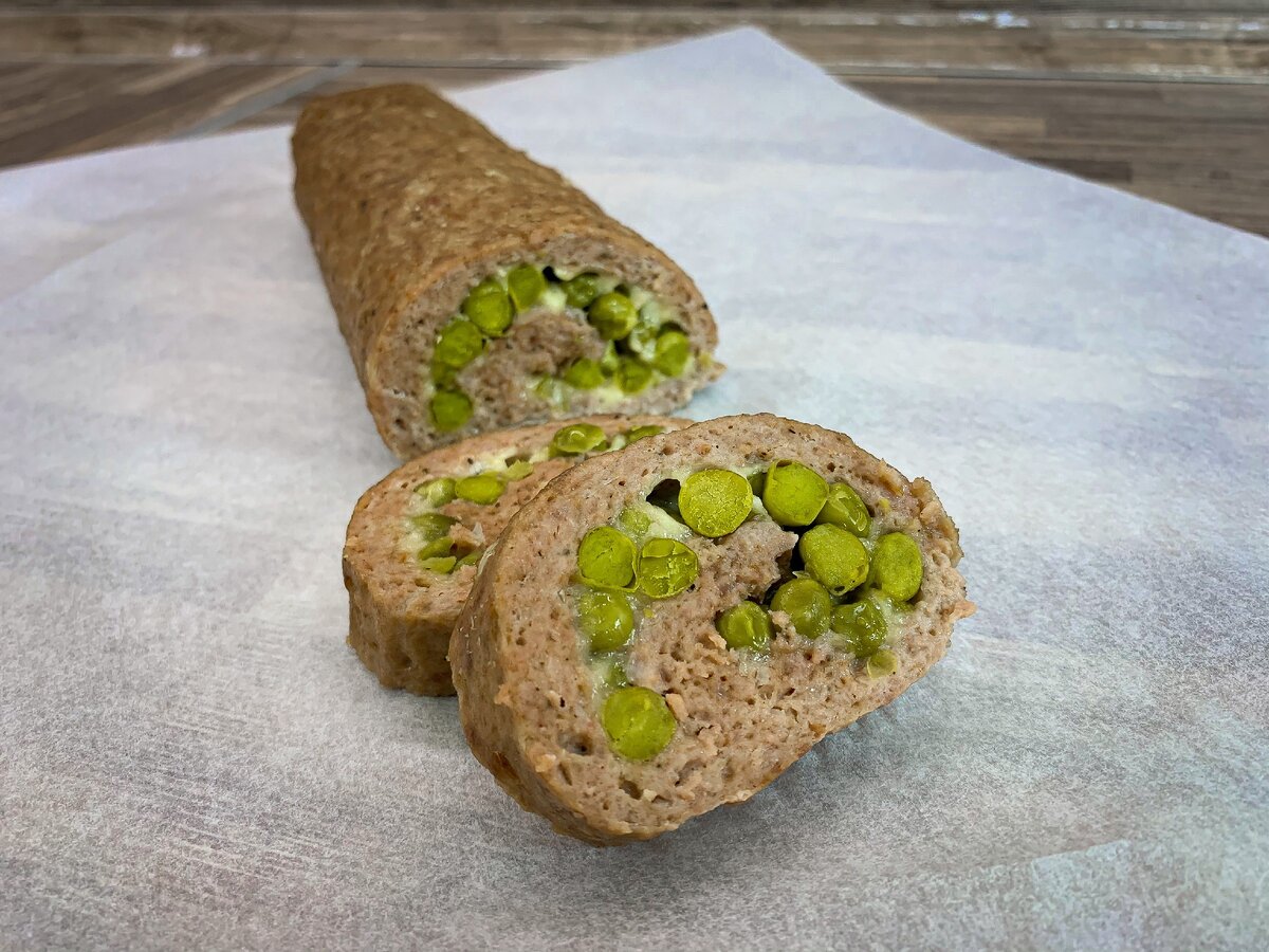 Мясной рулет с зелёным горошком.