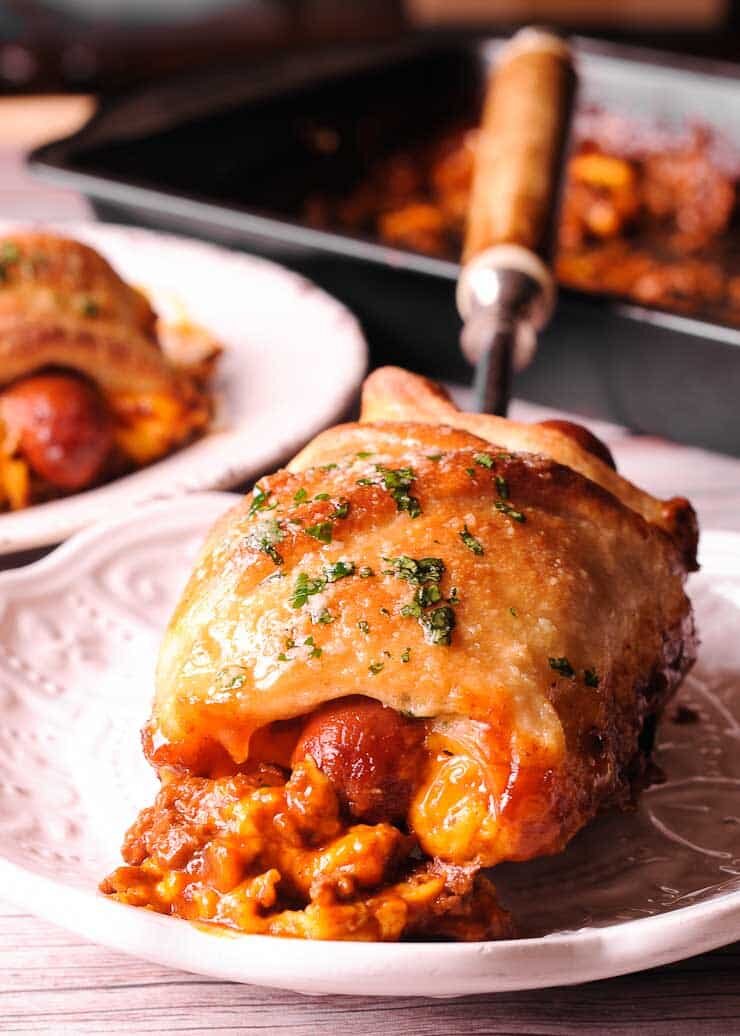 ВАЖНЫЙ ШАГ: Налейте перец чили в небольшую кастрюлю и доведите его до кипения. Вылейте острый перец чили в форму и равномерно распределите по ней. Положите завернутые хот-доги на острый перец чили. Убедитесь, что чили острый.