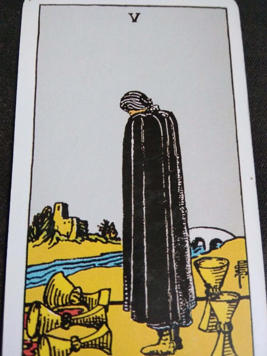 Карта дня 5 Кубков;Траур.Оплакивание того что ушло. Неудачи,потери но кое что удалось сохранить. Испытания в которых душа взросл