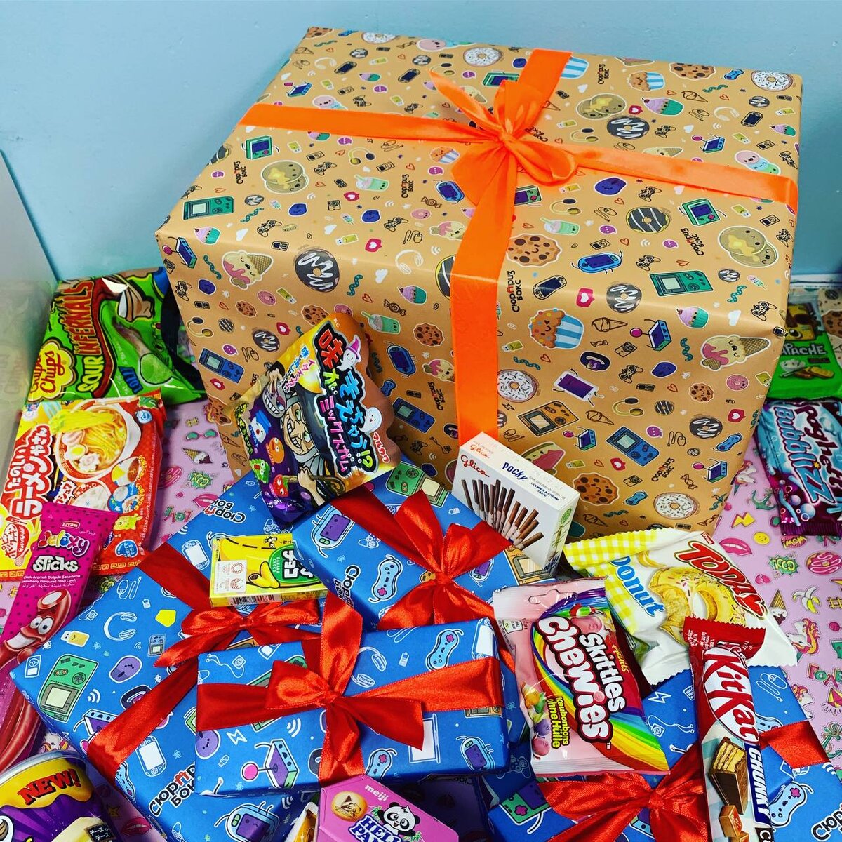 В состав входит 15 вкусняшек и 1 подарок: напиток, батончики, мармеладки, пончик, жевательные конфеты, жвачки, печенья, чипсы и один секретный подарок.