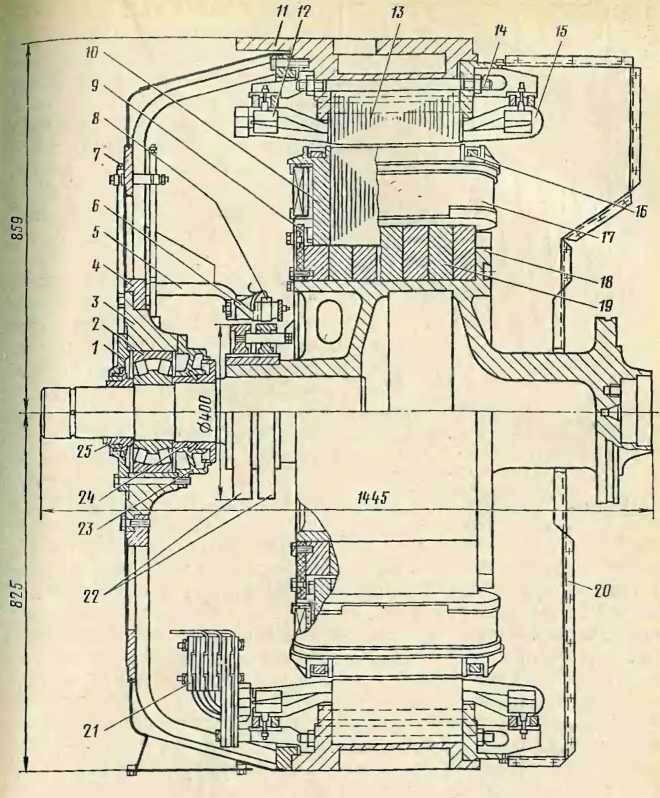 Рис. 86. Синхронный генератор ГС-504А: І - крышка подшипника; 2 - иодшипннк; 3 - ступица; 4 - подшипниковый щит; 5 - подвеска щеткодержателя; 6 - щеткодержатель; 7 - трубка; 8 - щетка; 9 - сегмент контактный; 10 - щека ротора; 11 - корпус статора; 12 - обмоткодержатель; 13 - сердечник статора; 14 - шпилька; 15 - обмотка статора; 16 - демпферная обмотка; 17 - полюс ротора; 18 - корпус ротора; 19 - обод ротора; 20 - входной патрубок; 21 - выводы обмоток статора и ротора; 22 - контактные кольца; 23 - крышка подшипника; 24, 25 - уплотнительные кольца