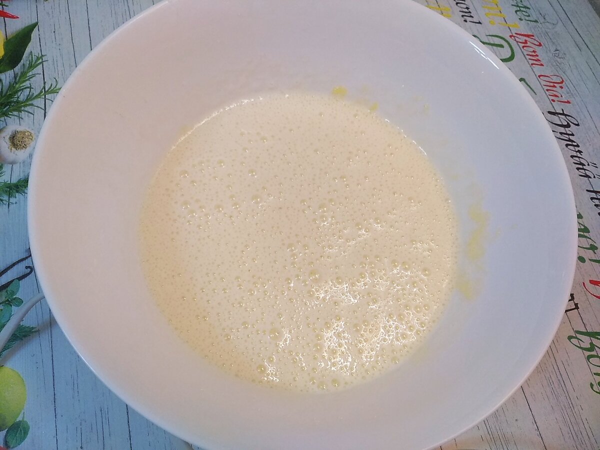 Четыре яйца разбить в глубокую миску добавить 200 г сахара и взбить миксером. Масса должна побелеть и увеличиться примерно вдвое.