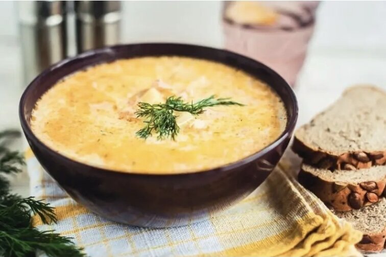- В кастрюлю добавляем картофель, варим 5-7 минут. Затем добавляем семгу, варим 3-5 минут. Вливаем сливки и варим до готовности картошки.