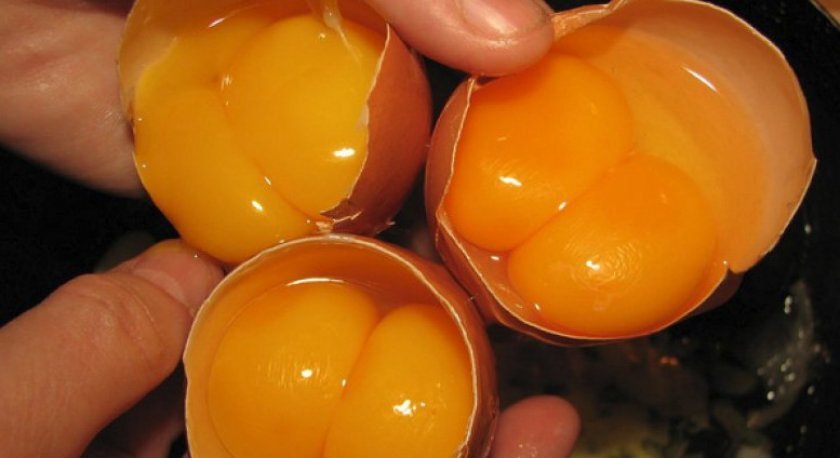 Это может быть вызвано многими причинами. Одна из них — возраст куры. Такие яйца чаще всего несут старые несушки под конец яйценоского периода. Это вызвано физиологическими изменениями, которые ослабляют яйцевод и его стенки. Поэтому два сформированных желтка могут оказаться в одном яйце. Но ничего опасного в этом нет.