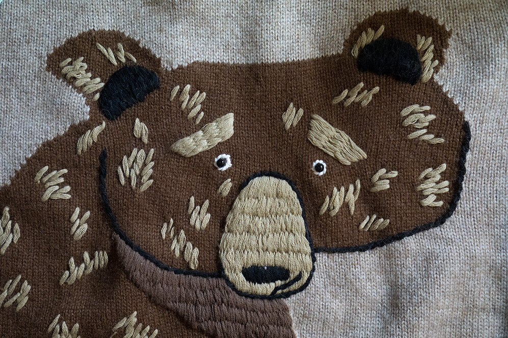 И несмотря на то, что у бренда потрясающе женственные платья из тканей с неповторимыми рисунками, мой выбор пал … на свитер. Свитера с животными всегда были моей слабостью, а пройти мимо медведя мы с мужем просто не смогли, поскольку мое домашнее прозвище – медведь. И это вовсе не потому, что я напоминаю медведя габаритами или характером. Все дело в любви моего мужа к плюшевым мишкам, поэтому изначально я была ласково названа медвежонком, а потом переименована в медведя для краткости.