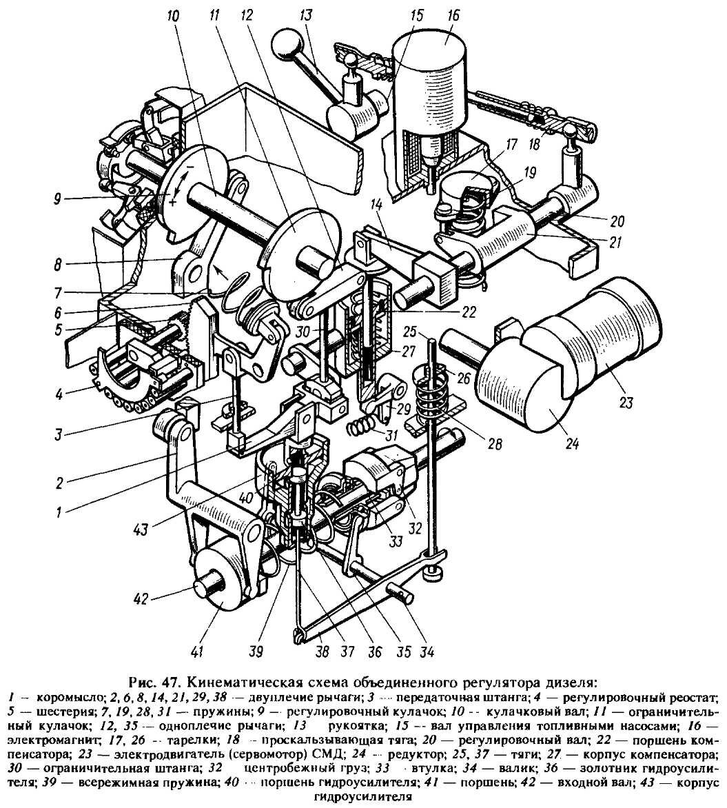 Основными узлами регулятора являются: привод, центробежный чувствительный элемент, гидравлический усилитель, компенсатор неравномерности хода, механизм дистанционного управления затяжкой всережимной пружины, регулятор мощности, механизм дистанционной остановки дизеля. На рис. 47 дана кинематическая схема, объединяющая все узлы регулятора в единое целое. Она позволяет понять его работу, но имеет некоторые конструктивные упрощения, связанные с трудностями плоскостного изображения сложного устройства регулятора. Конструкция и схема работы отдельных узлов регулятора показаны на рис. 49 — 60, причем обозначение деталей на них совпадает с обозначениями на рис. 47.