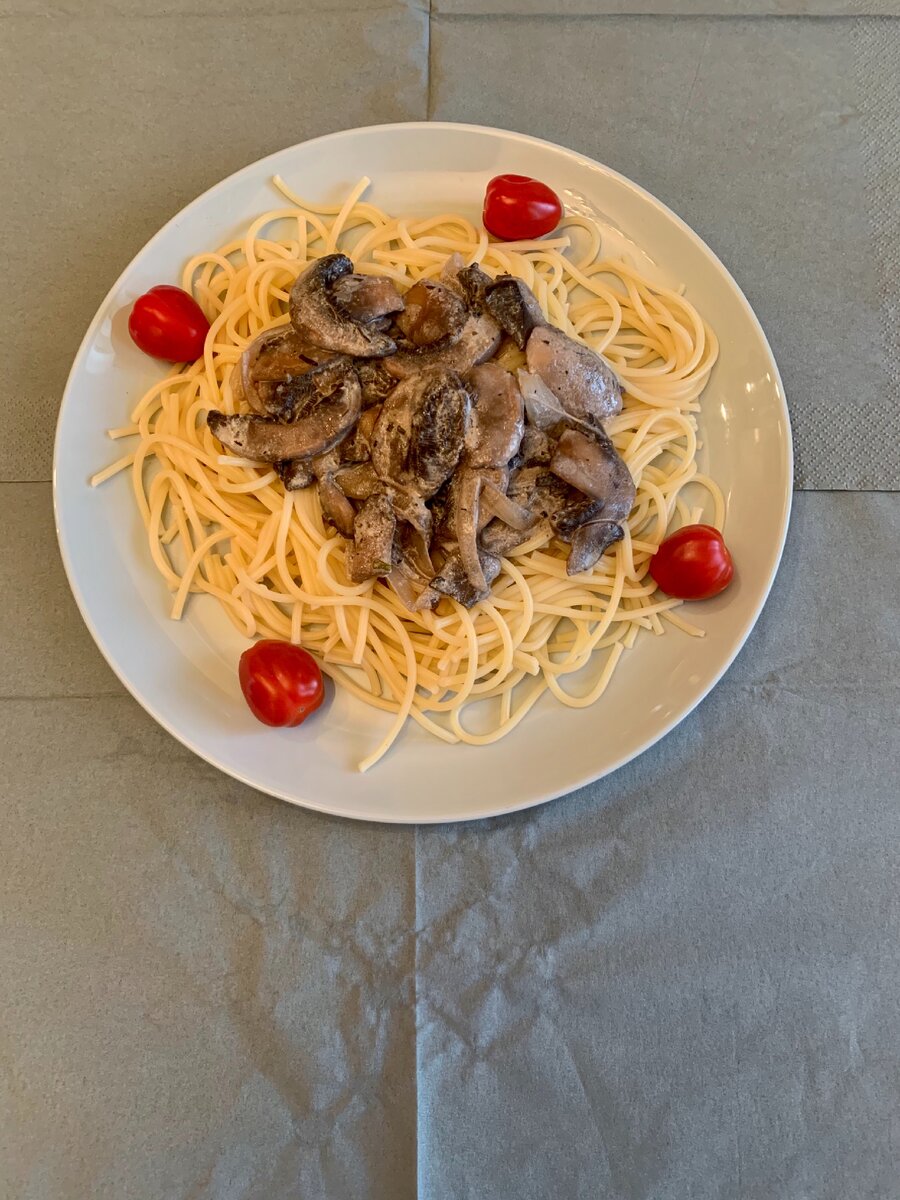 На тарелку выкладываем спагетти, а сверху сливочный соус с грибами.