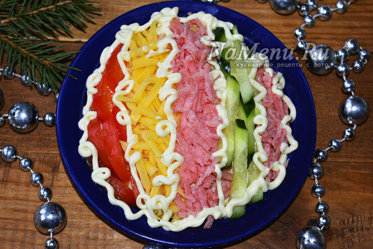 🥒Делим салат на виртуальных полосы, и выкладываем на первую – сыр, на вторую – колбасу, третью - огурцы, четвертую - помидор, пятую - колбасой