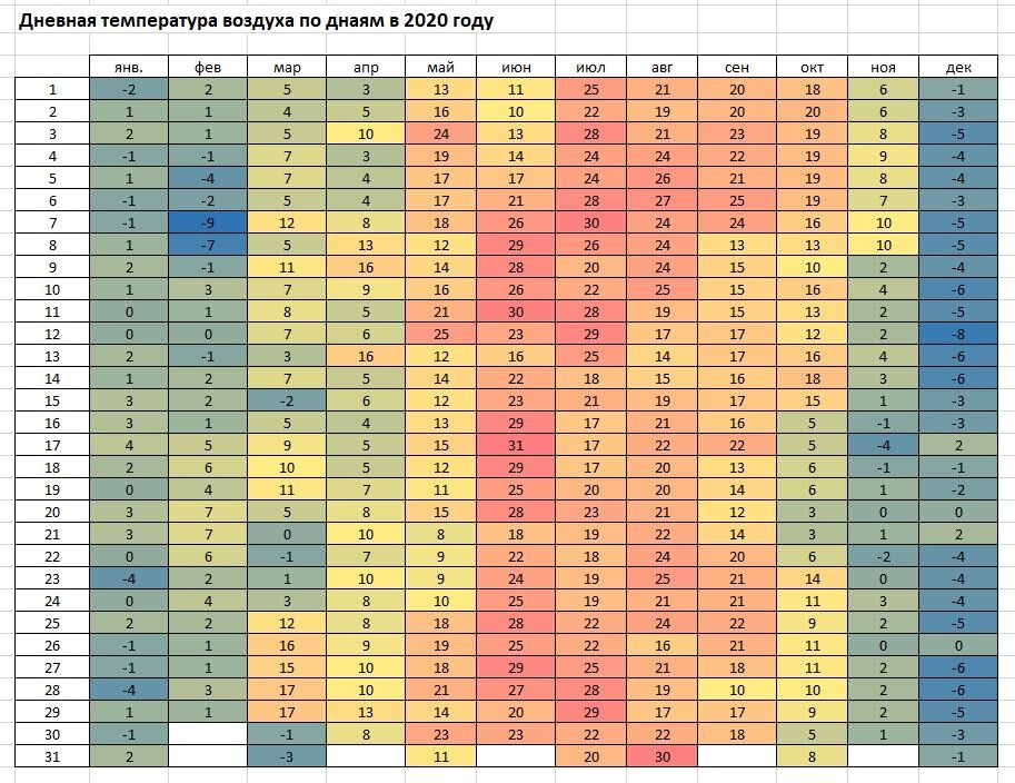 2020 год был очень тёплым годом в Москве. В дневное время не наблюдалось температур ниже -9 градусов, максимально плюсовые значения достигли 31 градусов, то есть годовое колебание температуры составило 40 градусов Цельсия.
