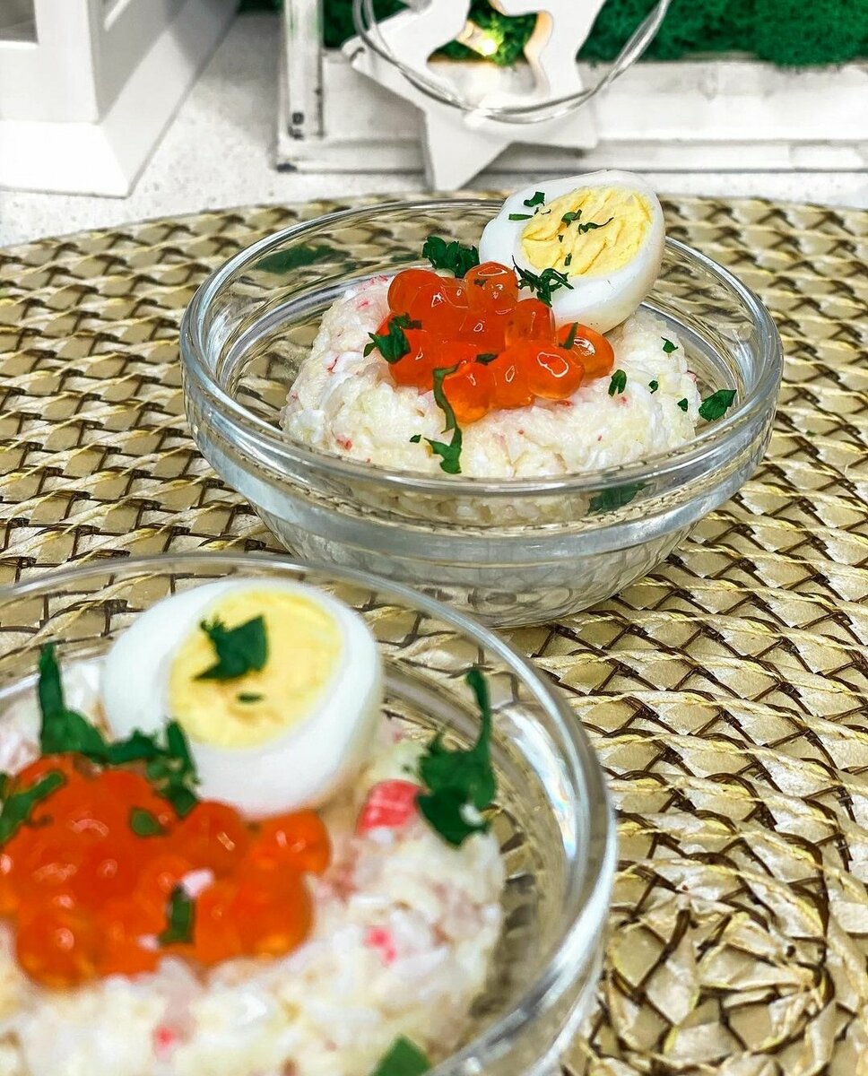 Мелко нарезать крабовые палочки, натереть на терке сыр и три яйца (перепелиное оставить для украшения). Все ингредиенты хорошо смешать с майонезом, слепить из них два аккуратных кружочка. Выложить их в пиалочки украсить разрезанным яйцом и икрой.