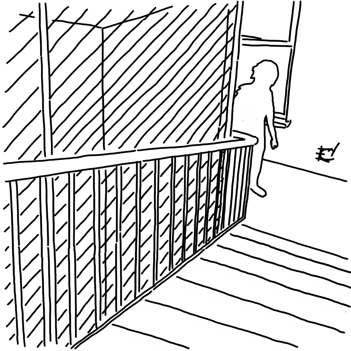 Обхватив столб руками и ногами, он полез выше - на третий этаж. Там тоже была галерея.