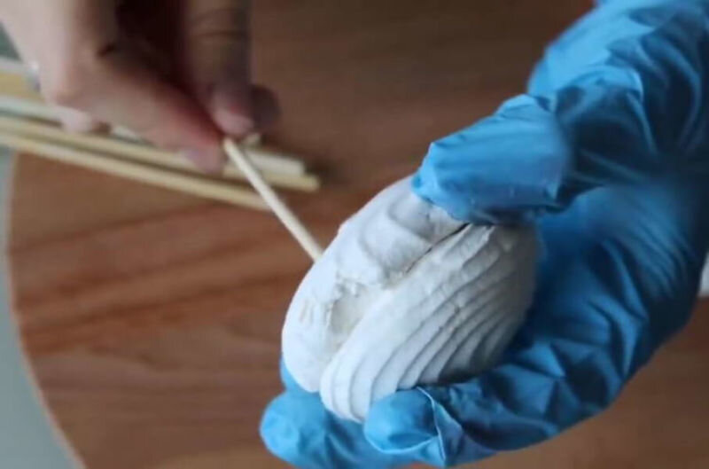 Для работы с продуктами используйте перчатки. Крупные зефирки проколите деревянными шпажками. Потребуется 4 штуки.