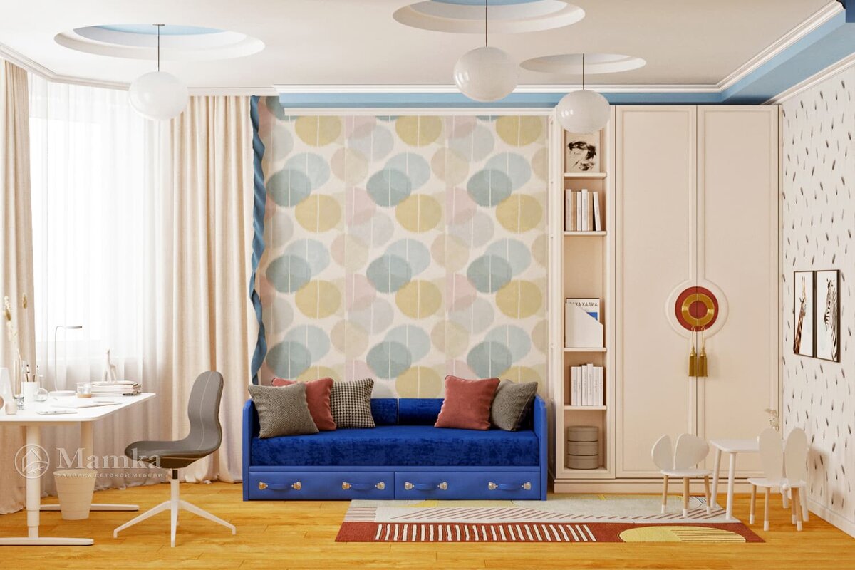 Слева от двустворчатого шкафа находится большой мягкий диван, который привносит яркий акцент в общую композицию комнаты. Его цвет является украшением детской. Мягкая синяя обивка из плюша создает атмосферу уюта. Диван без усилий трансформируется в удобную кровать для малыша.