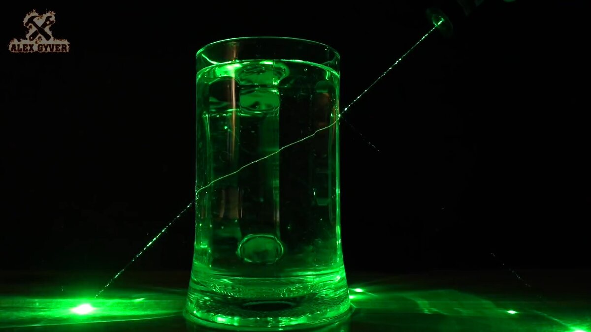 Для следующего эксперимента нам понадобится мощная лазерная указка и кружка с водой. Мы привыкли, что свет распространяется прямолинейно, то есть по одной линии, никогда никуда не сворачивая. Но что это? Луч лазера сломался! Причем сломался дважды! Невероятно. Эх, нужно было позвать вейперов, чтобы сделать эксперимент более зрелищным.