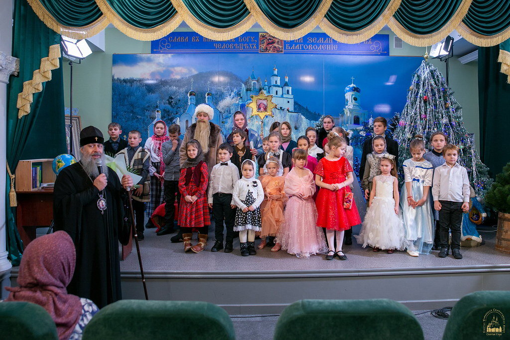 По прибытии в зал митрополита Арсения присутствующие совместно пропели тропарь Рождеству Христову. Далее с поздравительным словом к владыке Арсению, братии Лавры и всем присутствующим обратилась насельница Богородичанского скита в честь иконы Божией Матери «Всех скорбящих Радость» монахиня Агния (Кучеренко). Являясь автором сценария и режиссёром-постановщиком маленького детского спектакля под названием «Дедушка Январь», сестра Агния обратила внимание, что иногда знакомые или даже незнакомые нам люди выступают орудием в руках Божиих и направляют нас ко спасению. Потом эти люди становятся самыми родными и близкими для нас. Именно об этом рождественская история, которую разыграли на сцене дети.
