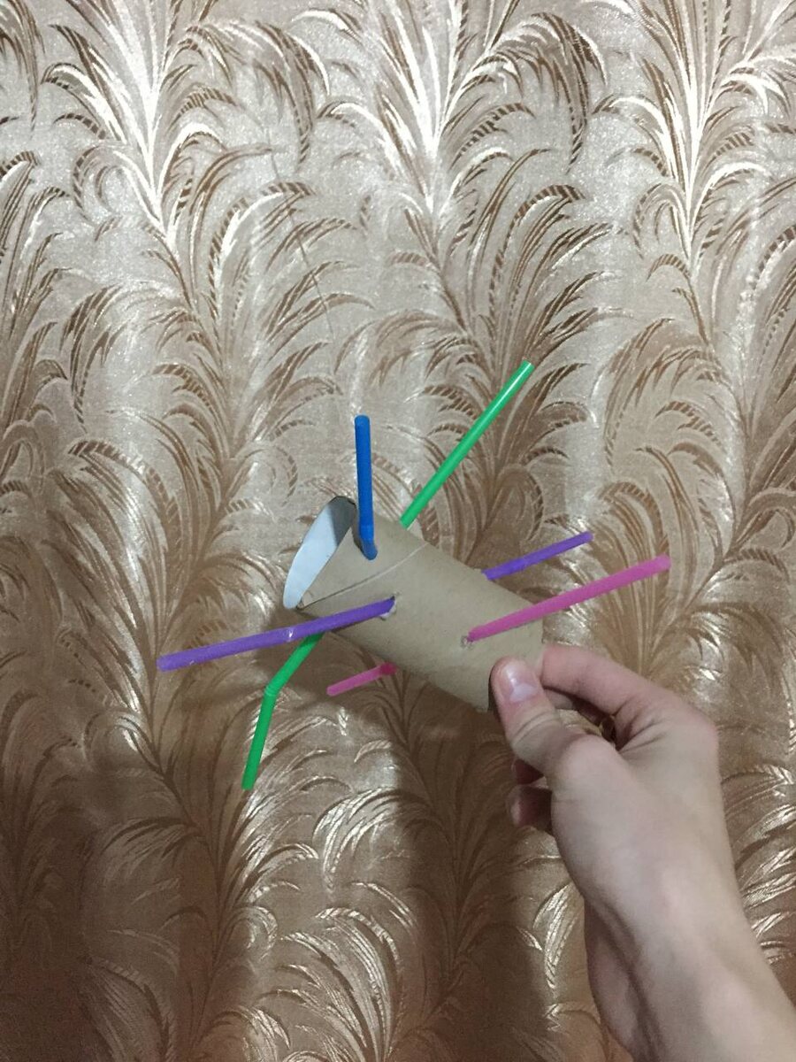 Достаточно простая игрушка, которую можно сделать без особых усилий. Как только у вас заканчивается туалетная бумага, то не смейте её выбрасывать. Из них можно много что сделать. С помощью шило я насквозь сделал несколько отверстий в разнобой и просунул туда обычные трубочки для коктейля. Для лучшей фиксации вы можете приклеить их на термоклей, но если у вас его нет, то ничего страшного.