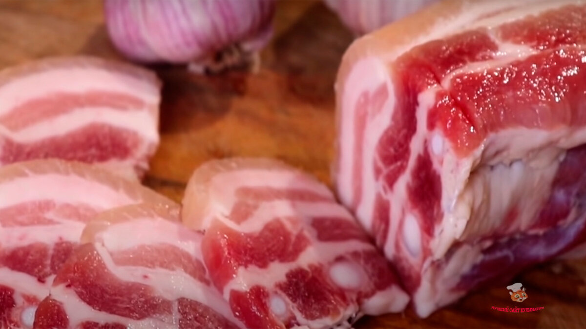 - Затем варим в течение 5 минут, до полного растворения соли. Далее грудинку нарезаем на кусочки, достаточно крупные. Чеснок нарезаем кружочками.