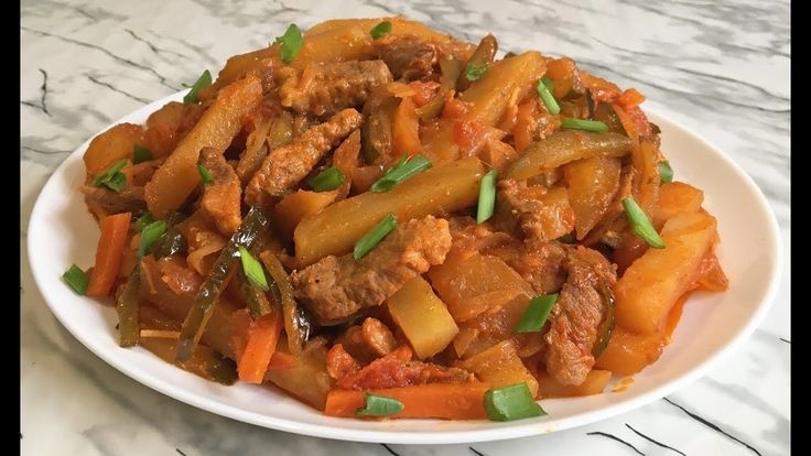 Мясо нарезаем полосками и жарим на масле. Добавляем лук. И жарим до мягкости лука. Добавляем томатную пасту. Соленные огурцы полосками. Картофель как для фри обжариваем на масле отдельно. До половины готовности. Переносимк мясу. Добавляем соль, перец. И доводим до готовности. Всем приятного аппетита!