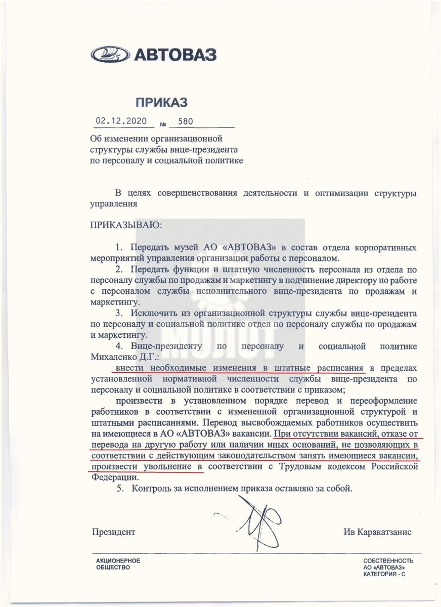 Председатель независимого профсоюза «МОЛОТ», депутат Думы г. о. Тольятти Григорий Басистый опубликовал два приказа Президента АО «АВТОВАЗ» Ива Каракатзаниса. Содержание документов дает повод предположить о предстоящих частичных увольнениях сотрудников.