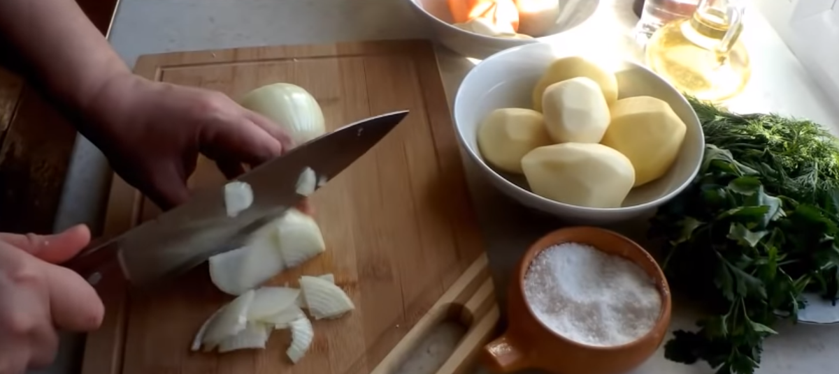 Я поставила варится свинину и пока мясо не будет хорошо отходить от костей я не буду вынимать из бульона мясо. Значит мы можем порезать лук, морковь и картофель.