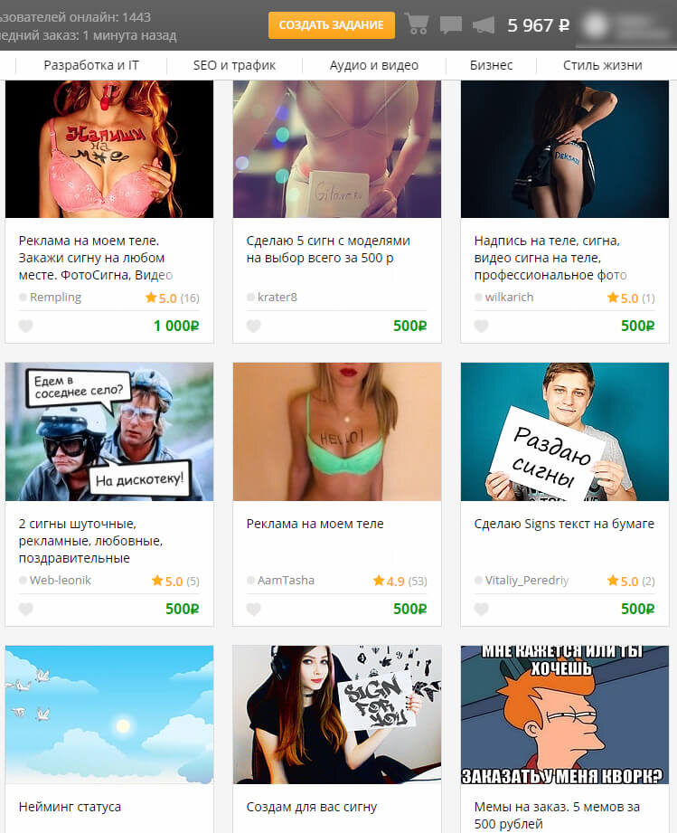 - Подписи (сигны). Вы можете делать рекламные подписи и фотографироваться с ними. Сами подписи можно размещать на белых листах или даже на своем теле. От вашей изобретательности зависит цена и количество заказов. Пример подобных заказов на Kwork: